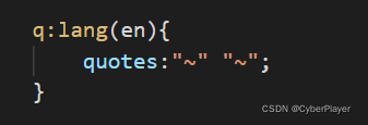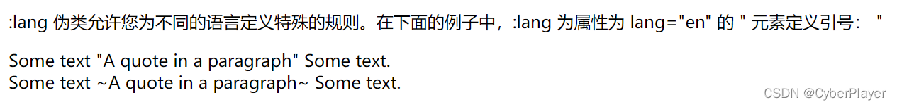 在下面的例子中,:lang 为属性为 lang="en" 的 <q> 元素定义引号: