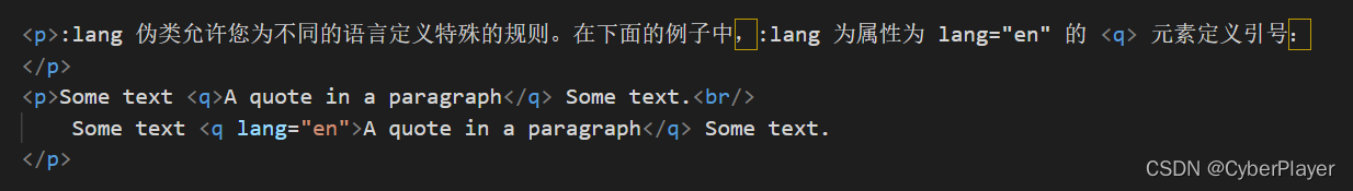 :lang 伪类允许为不同的语言定义特殊的规则。