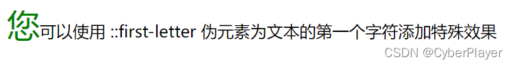 ::first-letter 伪元素用于向文本的首字母添加特殊样式。