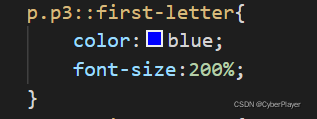 上面的例子将以蓝色和较大的字体显示 class="p3" 的段落的首字母。