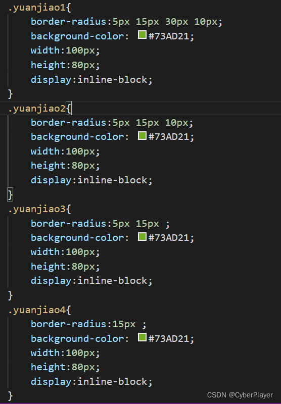 一个值 - border-radius: 15px;(该值用于所有四个角,圆角都是一样的)
