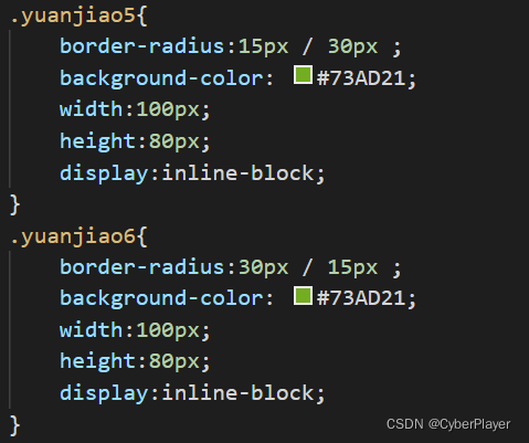 两个值 - border-radius: 15px 50px;(第一个值用于左上角和右下角,第二个值用于右上角和左下角):