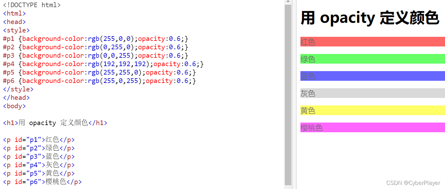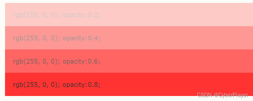 CSS opacity 属性设置整个元素的不透明度(背景颜色和文本都将是不透明/透明的)。