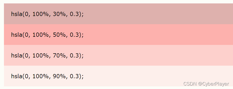HSLA 颜色值由以下参数规定:hsla(hue, saturation, lightness, alpha),其中 alpha 参数定义不透明度。 alpha 参数是介于 0.0(完全透明)和 1.0(完全不透明)之间的数字。