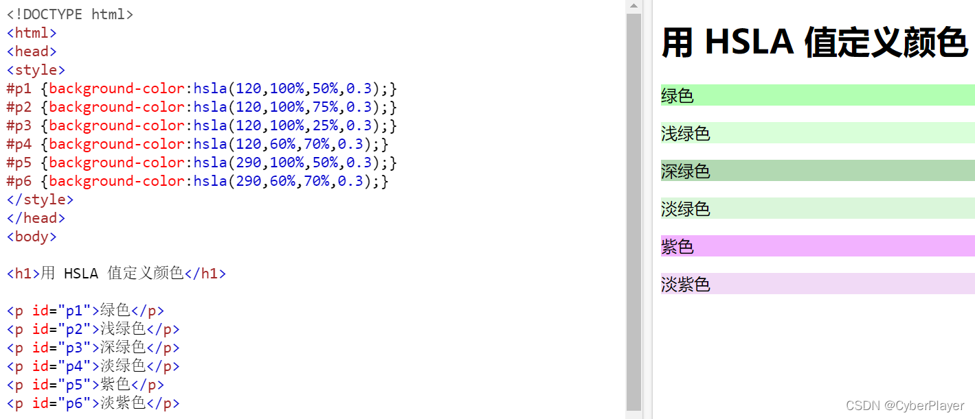 HSLA 颜色值是带有 Alpha 通道的 HSL 颜色值的扩展 - 它规定了颜色的不透明度。