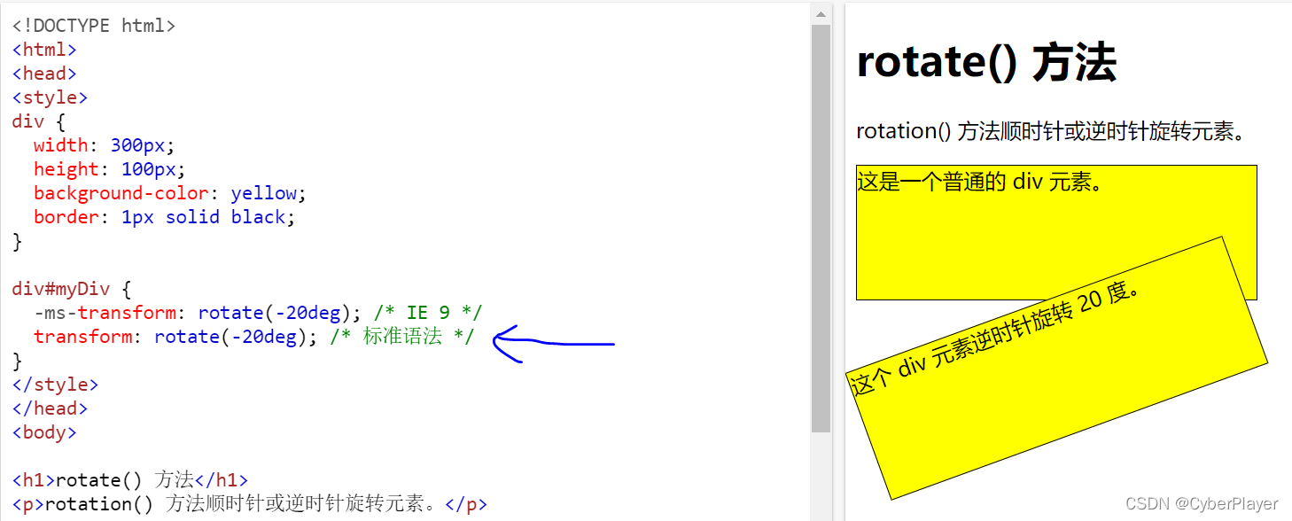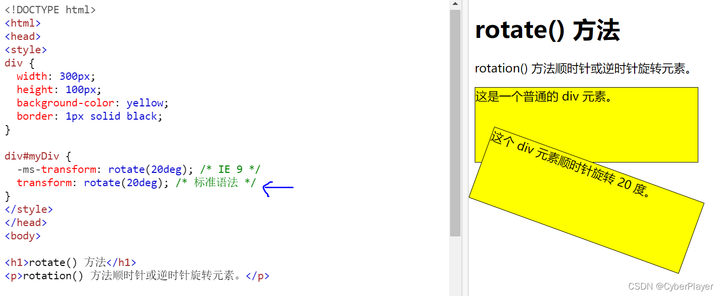 下面的例子把 <div> 元素逆时针旋转 20 度: