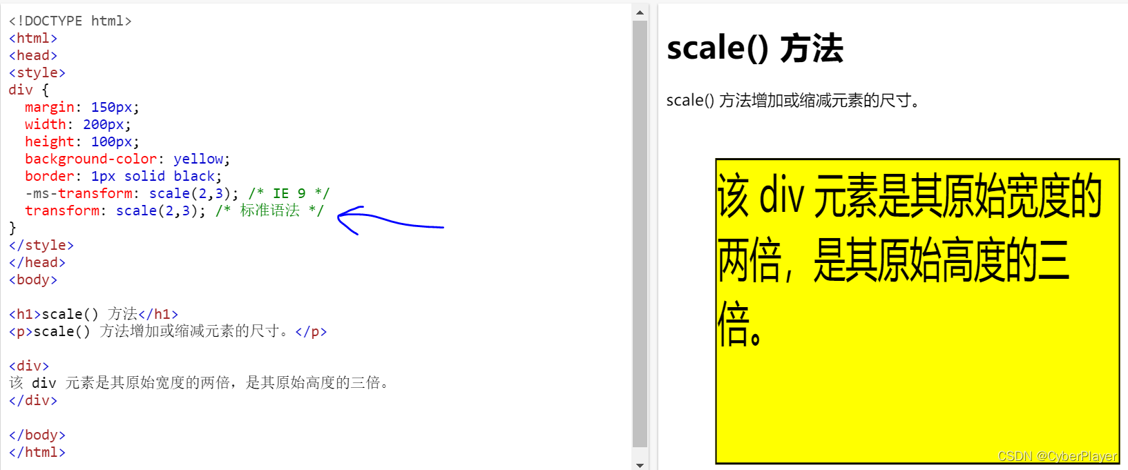 下面的例子把 <div> 元素增大为其原始宽度的两倍和其原始高度的三倍: