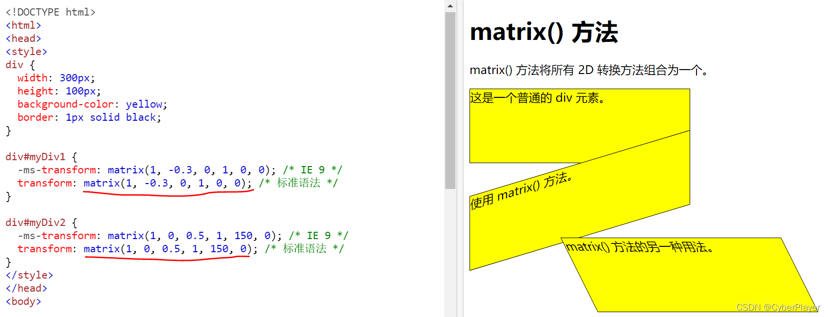 matrix() 方法可接受六个参数,其中包括数学函数,这些参数使您可以旋转、缩放、移动(平移)和倾斜元素。