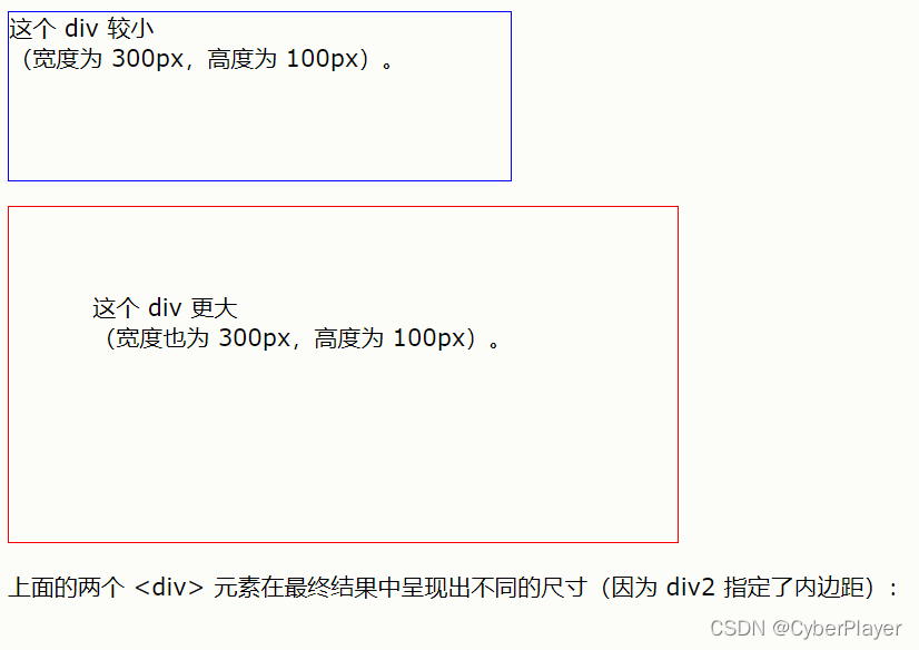 这意味着:当设置元素的宽度/高度时,该元素通常看起来比设置的更大(因为元素的边框和内边距已被添加到元素的指定宽度/高度中)。