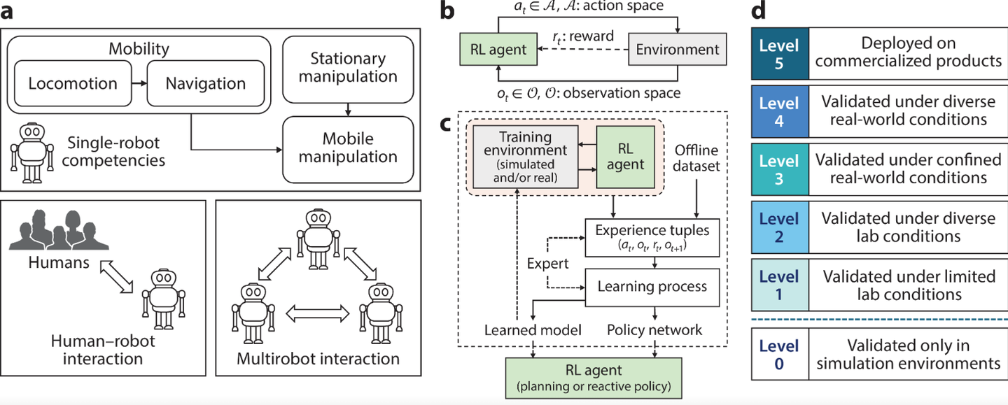 (a) 通过DRL习得的机器人能力,(b) 问题表述方式,(c) 解决方案设计方法,(d) 实际应用成功度。 来源:doi.org/10.1146/annurev-control-030323-022510
