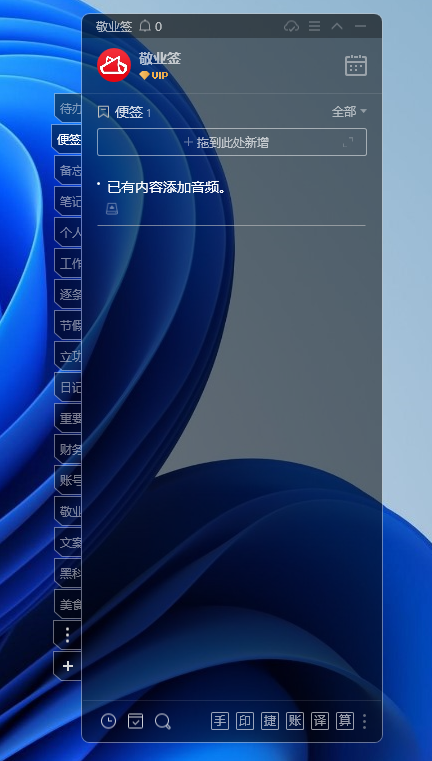 在使用笔记软件的时候,很多用户除了记录文字内容之外,经常也会在笔记软件中保存一些其他类型的文件,比如音频文件。而保存音频文件的功能,并不是每一款笔记软件都具备,好用的笔记软件怎么添加音频文件呢?以Windows电脑端敬业签为例: