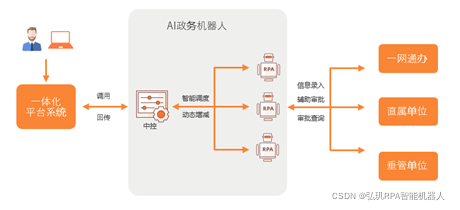 AI 政务机器人以非侵入方式实现服务平台与垂管系统的对接,将接收到的服务平台的事项数据,自动填入垂管系统,从而实现事项流程自动化。