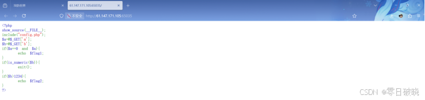 1.打开页面,进行代码审计,发现同时满足 $a==0 和 $a 时,显示flag1。