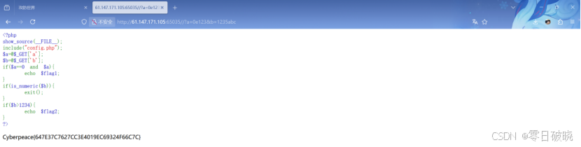 is_numeric()函数会返回true对科学计数法(如1e3)、十六进制(如0x1000)等非预期输入,当返回为ture时,exit()阻止此类输入。且$b>1234才会触发显示flag2