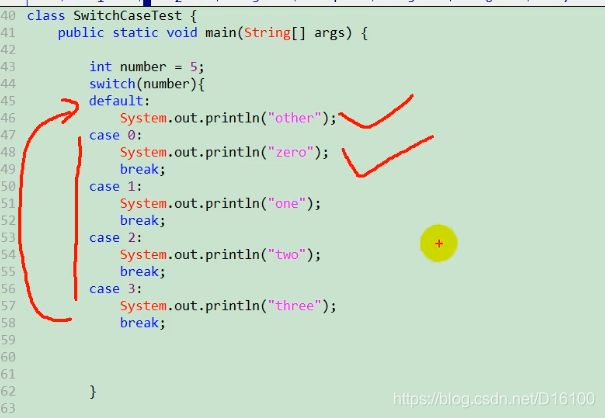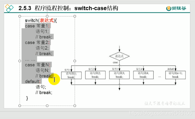 根据switch表达式中的值,依次匹配各个case中的常量。 一旦匹配成功,则进入相应case结构中,调用相应的执行语句,当调用完执行语句之后,则任然会继续向下执行其他case结构中的执行语句,直到遇到break关键字后者此switch-case结构末尾结束为止。