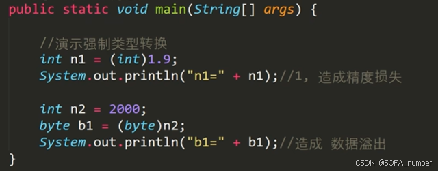 自动类型转换的逆过程,将容量大的数据类型转换为容量小的数据类型,要使用强制转换符(),可能会造成精度降低或溢出。