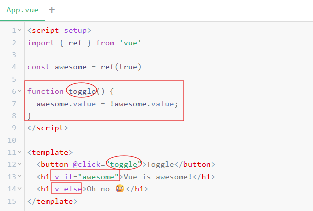 实例:现在,示例程序同时展示了两个 <h1> 标签,并且按钮不执行任何操作。尝试给它们添加 v-if 和 v-else 指令,并实现 toggle() 方法,让我们可以使用按钮在它们之间切换。