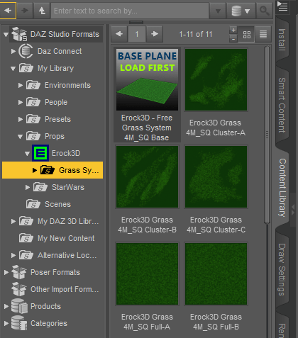 dForce的另一个有趣的功能是,可以按照之前看到的原理来创建用作地形的网格,这很容易做到。首先,我们将在此处下载免费的草着色器。 如果您需要安装方面的帮助,请参阅如何手动安装Daz3d Content文章。一旦下载并安装到我们的Daz库中,我们将继续打开该软件。我们需要做的是创建地形的拓扑。 我们将寻找已安装内容的文件夹。并双击Erock3d子文件夹内的基础平面。新平面应已装载。