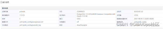 接入D-SMART后我们就可以仔细端详一下PolarDB了,从版本信息可以看出,PolarDB基于PostgreSQL的11.9.18.从发行版本信息中可以看出,该版本是兼容Oracle数据库的,这和PolarDB-O的宣传是一致的,据说与Oracle的语法保持了90%以上的兼容性。
