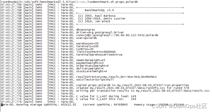 最后我们来看看性能,通过BenchMark 5.0,我们可用看到刚开始时候TPMC大约为54万,逐渐降低到40多万,最后稳定在40万多点的地方。这个性能基线和PG 11大致相当。我们使用的存储时nvme ssd,从存储层面上看,IO性能尚佳。
