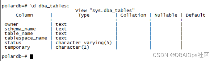 rowid, rownum也是支持的。Dba_tables/dba_indexes等视图也同样存在,只是字段与Oracle之间不太兼容,少了很多。只是简单的把PG的元数据做了一个翻译而已。