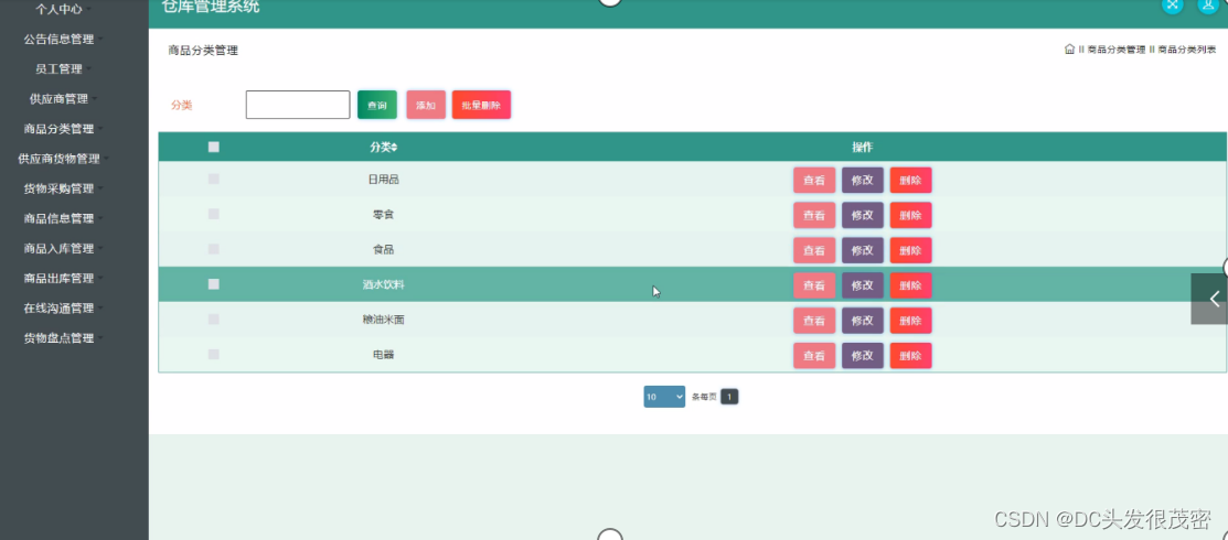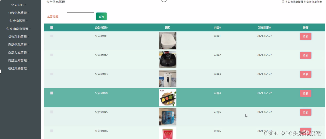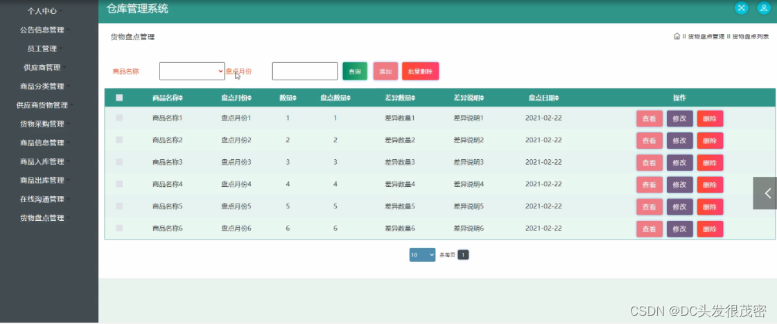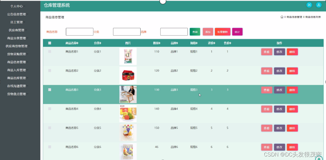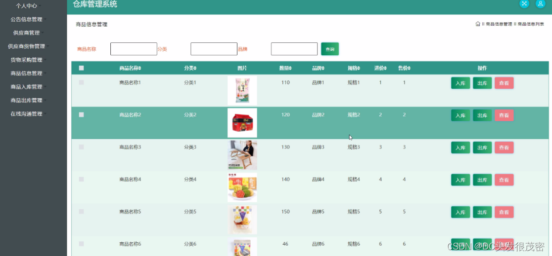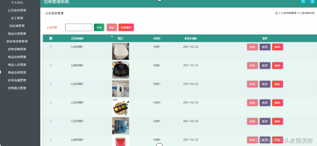 智能仓储系统 ,在智能仓储系统可以查看个人中心、公告信息管理、员工管理、供应商管理、商品分类管理、供应商货物管理、货物采购管理、商品信息管理、商品入库管理、商品出库管理、在线沟通管理、货物盘点管理等内容