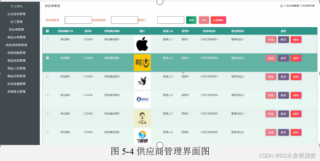 供应商管理,在供应商管理页面可以查看供应商账号、密码、供应商名称、图片、联系人、联系电话、联系地址等信息进行修改、删除、查看
