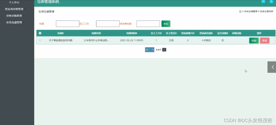 在线沟通管理,在在线沟通管理页面可以查看标题、沟通内容、沟通时间、员工工号、员工姓名、供应商账号、供应商名称、是否审核、审核回复等信息进行查看、修改、删除