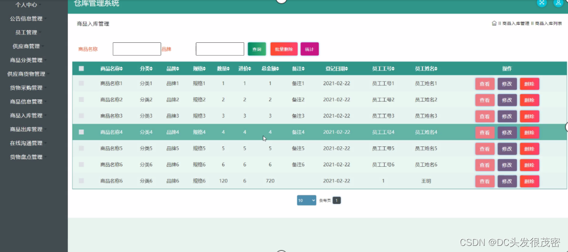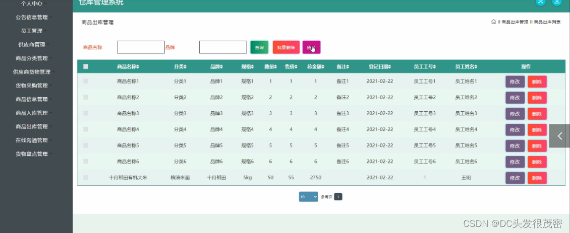 商品出库管理,在商品出库管理页面可以查看商品名称、分类、品牌、规格、数量、售价、总金额、备注、登记日期、员工工号、员工姓名等信息进行查看、修改、删除