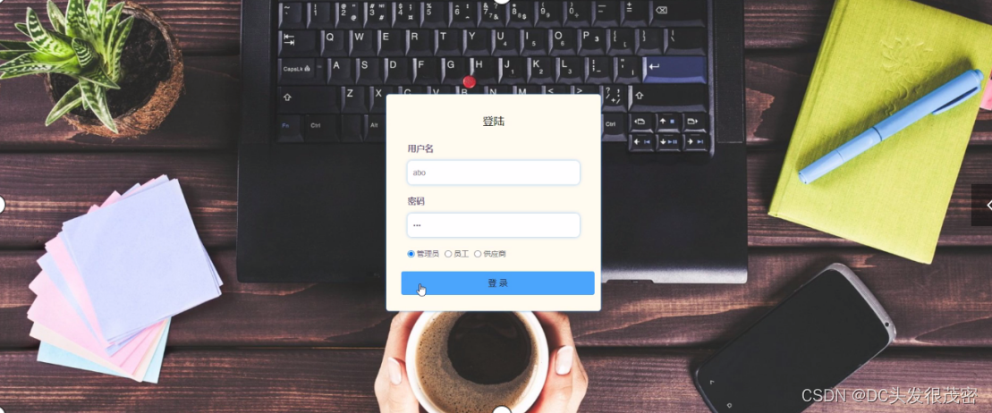 管理员登录,通过填写用户名、密码等信息,输入完成后选择登录即可进入智能仓储系统