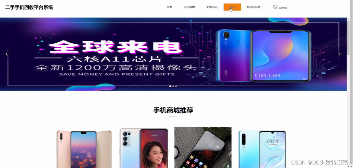 二手手机回收平台系统,在系统首页可以查看首页、手机商城、新闻资讯、我的、跳转到后台、购物车等内容