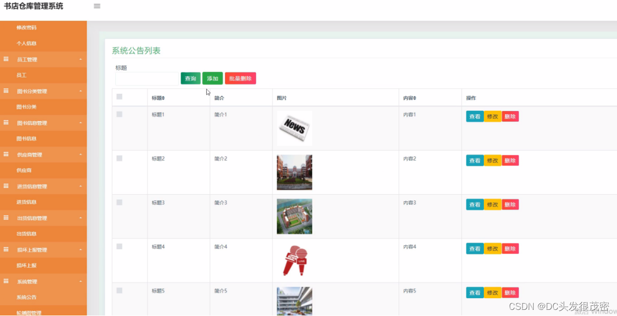 系统管理;管理员通过系统管理页面查看系统公告/轮播图等进行上传图片进行添加、删除、修改以及查看发布公告整个系统进行维护等操作