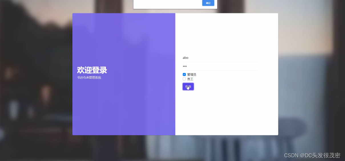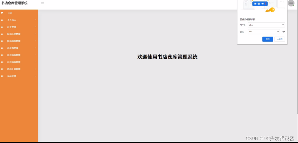 管理员通过用户名和密码填写完成后进行登录,如图5-1所示。管理员登录成功后进入到系统操作界面,可以对主页、个人中心、员工管理、图书分类管理、图书信息管理、供应商管理、进货信息管理、出货信息管理、损坏上报管理、系统管理等功能模块进行相对应操作