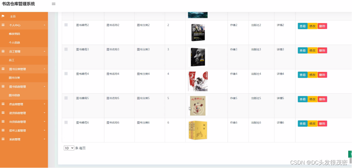 图书信息管理:管理员通过列表可以获取图书编号、图书名称、图书分类、数量、图片、作者、出版社、详情等信息,进行修改或删除操作