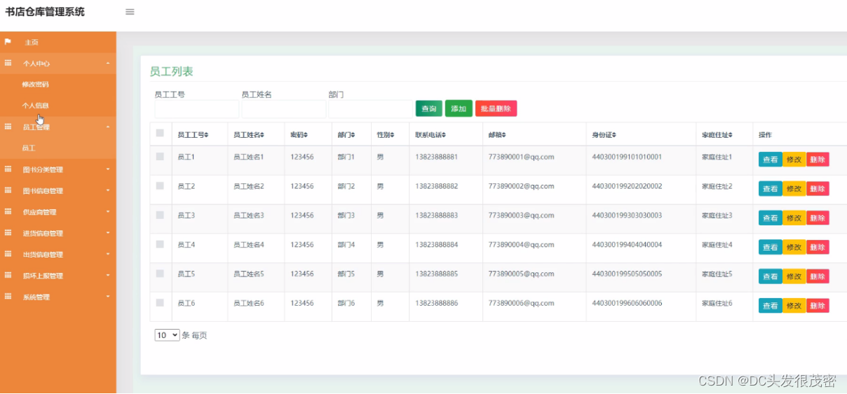 员工管理:通过列表可以获取员工工号、员工姓名、密码、部门、性别、联系电话、邮箱、身份证、家庭住址等信息,进行修改或删除操作