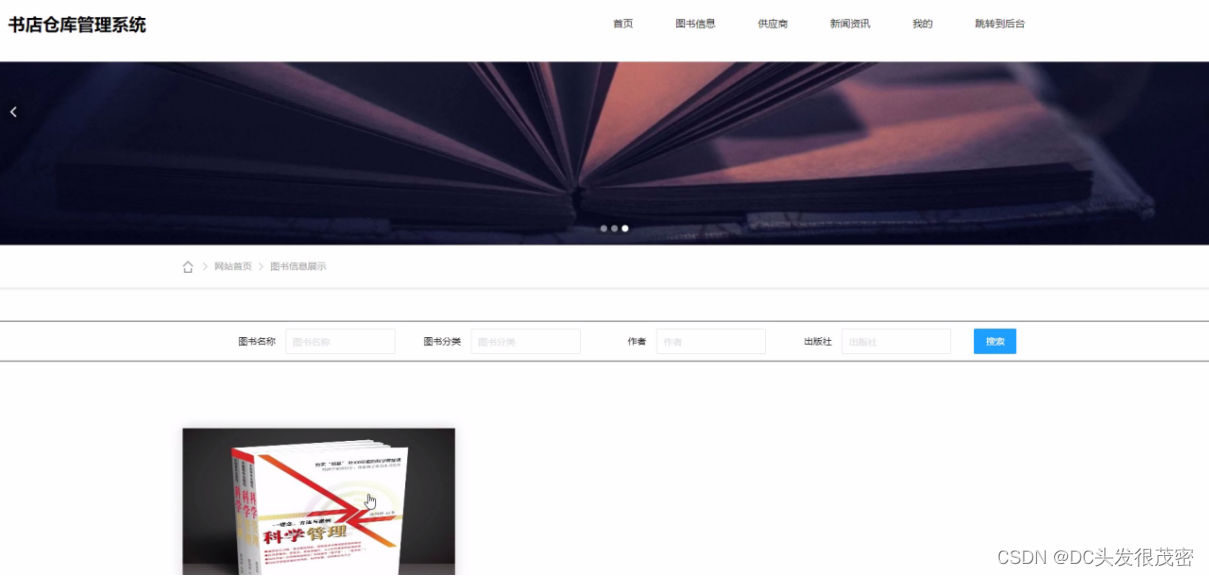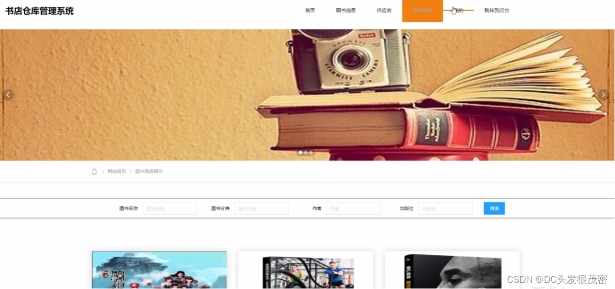书店仓库管理系统,在书店仓库管理系统可以查看首页、图书信息、供应商、新闻资讯、我的、跳转到后台等内容