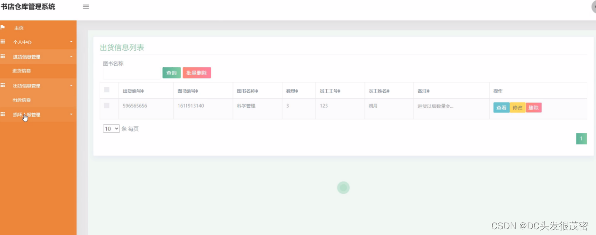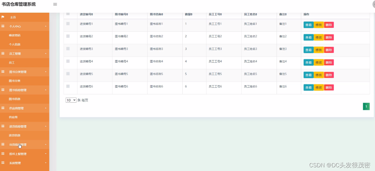 进货信息:管理员通过列表可以获取进货编号、图书编号、图书名称、数量、员工工号、员工姓名、备注等信息,进行修改或删除操作