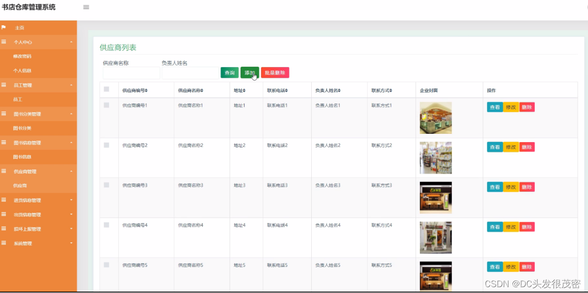 供应商管理:管理员通过列表可以获取供应商编号、供应商名称、地址、联系电话、负责人姓名、联系方式、企业封面等信息,进行修改或删除操作