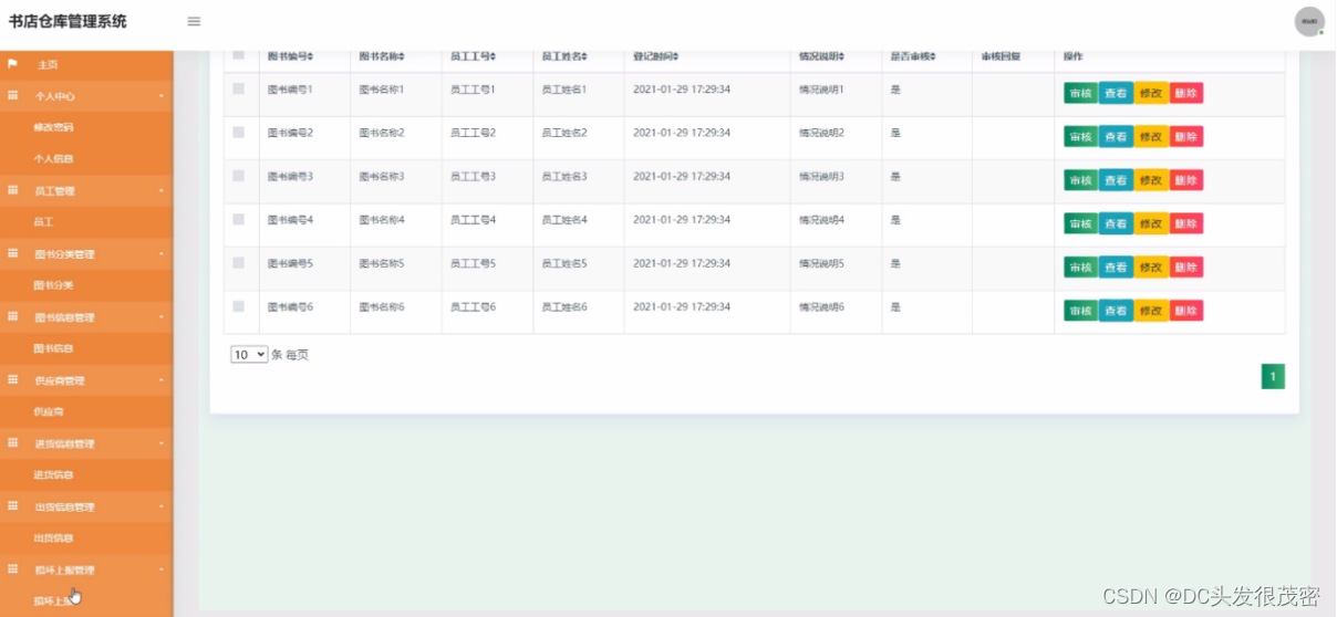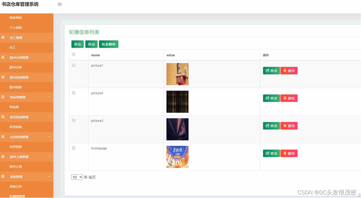 系统管理也都将通过计算机进行整体智能化操作,对于书店仓库管理系统所牵扯的管理及数据保存都是非常多的,例如管理员;主页、个人中心、员工管理、图书分类管理、图书信息管理、供应商管理、进货信息管理、出货信息管理、损坏上报管理、系统管理、用户;主页、个人中心、进货信息管理、出货信息管理、损坏上报管理,前台首页;首页、图书信息、供应商、新闻资讯、我的、跳转到后台等,这给管理者的工作带来了巨大的挑战,面对大量的信息,传统的管理系统,都是通过笔记的方式进行详细信息的统计,后来出现电脑,通过电脑输入软件将纸质的信息统计到电脑上,这种方式比较传统,而且想要统计数据信息比较麻烦,还受时间和空间的影响,所以为此开发了书店仓库管理系统;为用户提供了方便管理平台,方便管理员查看及维护,并且可以通过需求进行图书信息内容的编辑及维护等;对于用户而言,可以随时进行查看图书分类和进货信息、出货信息、损坏上报等,管理员可以足不出户就可以获取到系统的数据信息等,而且还能节省用户很多时间,所以开发书店仓库管理系统给管理者带来了很大的方便,同时也方便管理员对用户信息进行处理。
