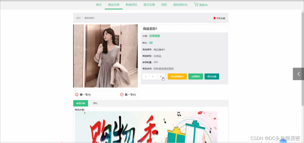 登录,在登录页面通过填写账号、密码、类型等信息完成登录,如图5-3所示。商品信息页面通过填写商品编号、商品名称、商品类型、库存数量、商品说明、积分、价格等信息进行立即购买操作,如图5-4所示。