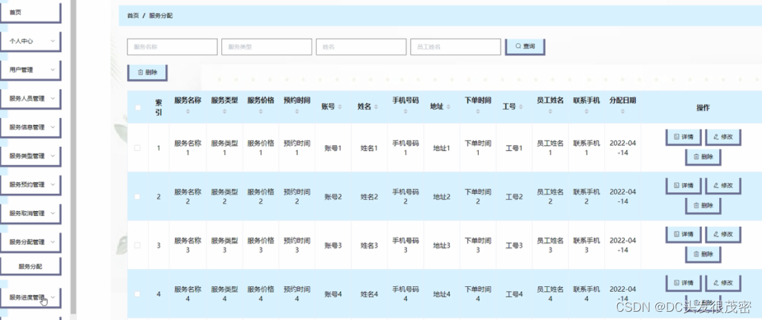 服务分配管理,在服务分配管理页面中可以对索引、服务名称、服务类型、服务价格、预约时间、账号、姓名、手机号码、地址、下单时间、员工姓名、联系手机、分配日期等内容进行详情、取消、修改或删除等操作