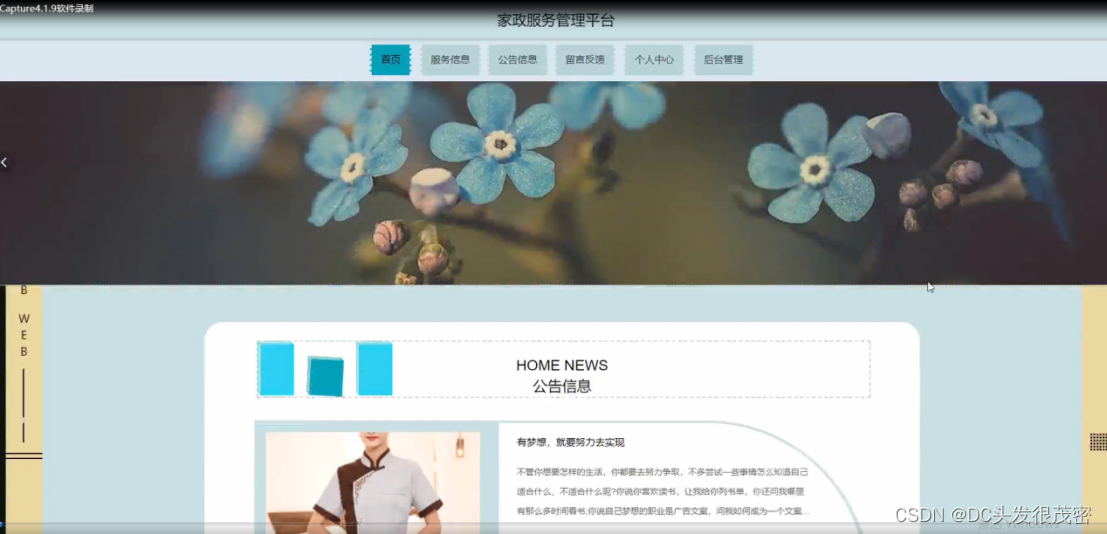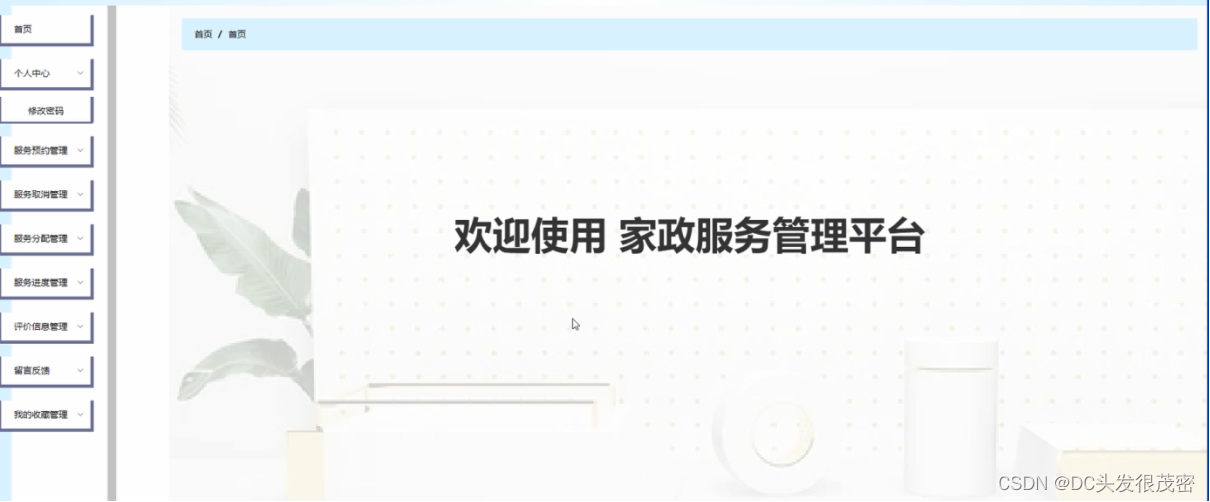家政服务管理平台采用了B/S结构,JAVA作为开发语言,数据库采用了B/S结构,Mysql数据库进行开发。该系统包括前台操作和后台管理两个部分,一方面,为用户提供首页、服务信息、公告信息、留言反馈、个人中心、后台管理等功能;另一方面,为管理员提供首页、个人中心、用户管理、服务人员管理、服务信息管理、服务类型管理、服务预约管理、服务取消管理、服务分配管理、服务进度管理、评价信息管理、留言反馈、系统管理等功能。
