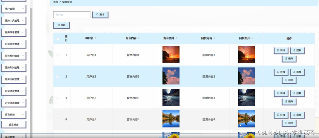 留言反馈,在留言反馈页面中可以对索引、用户名、留言内容、留言图片回复内容、回复图片等内容进行详情、回复或删除等操作