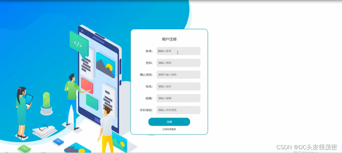用户注册,通过填写账号、密码、确认密码、姓名、邮箱、手机号码等内容进行注册等操作