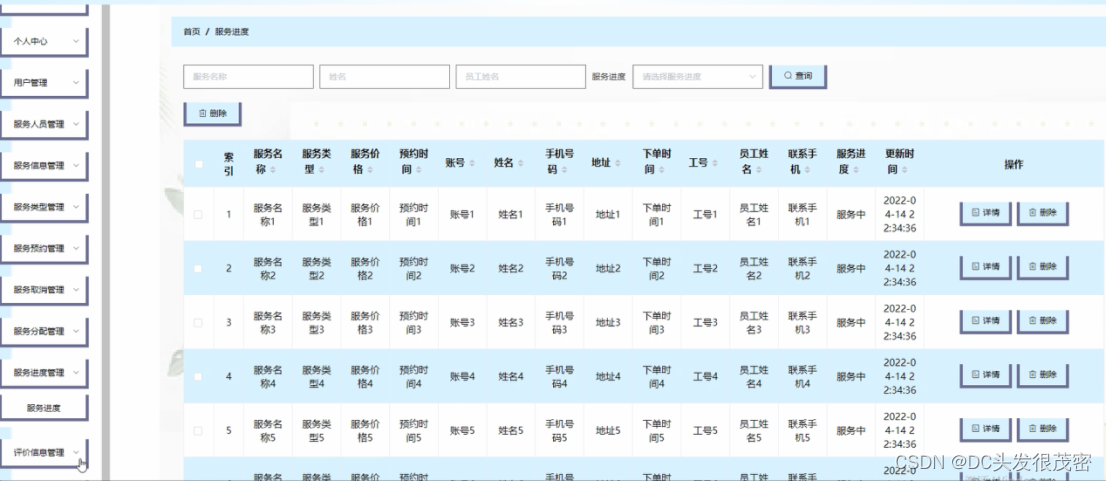 服务进度管理,在服务进度管理页面中可以对索引、服务名称、服务类型、服务价格、预约时间、账号、姓名、手机号码、地址、下单时间、工号、员工姓名、联系手机、服务进度、更新时间等内容进行详情或删除等操作