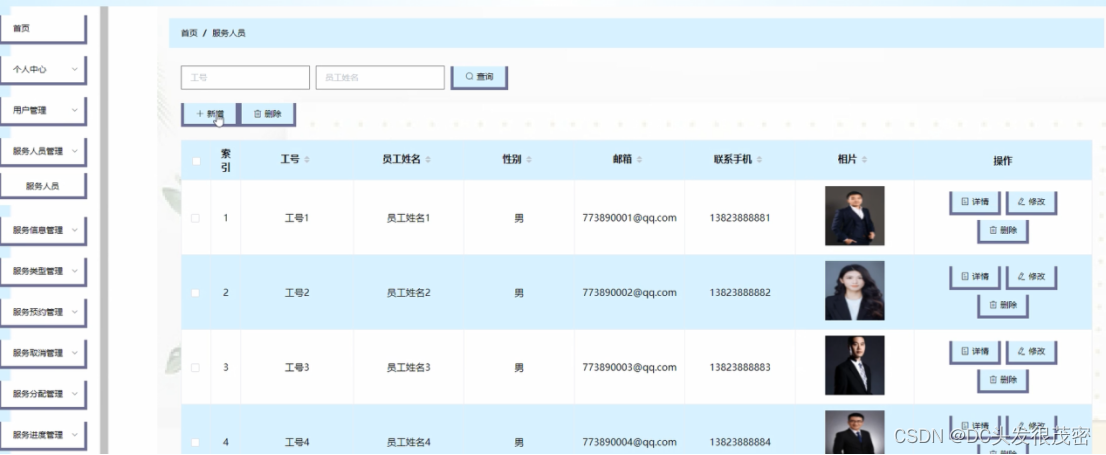服务人员管理,在服务人员管理页面可以对索引、工号、员工姓名、性别、邮箱、联系手机、相片等内容进行详情、修改或删除等操作
