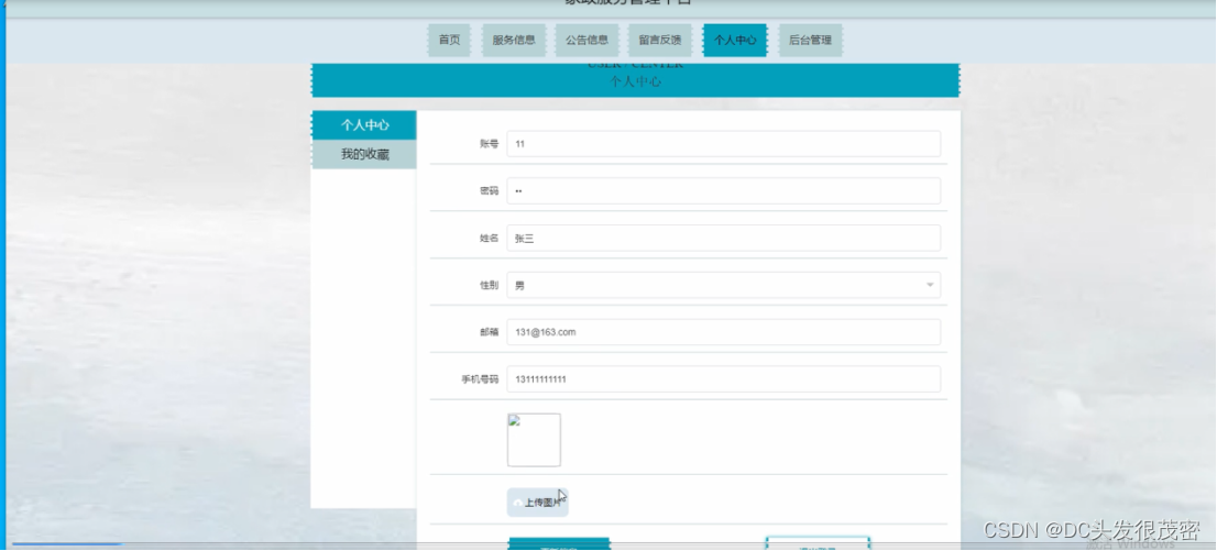 个人中心,在个人中心页面中通过填写账号、密码、性别、姓名、邮箱、手机号码、图片等内容进行更新信息等操作,并可根据需要对我的收藏进行相应等操作