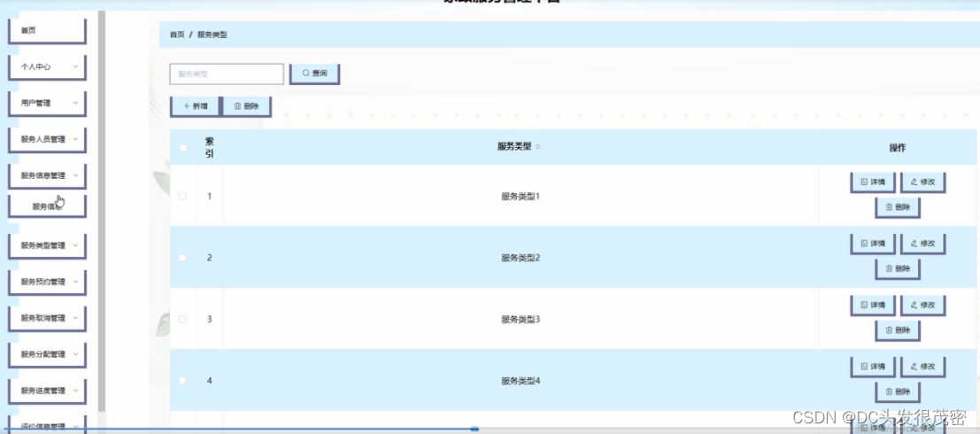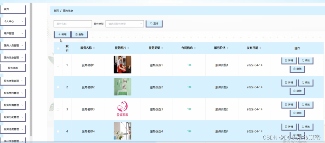 服务信息管理,在服务信息管理页面可以对索引、服务名称、服务图片、服务类型、合同信息、服务价格、发布日期等内容进行详情、修改或删除等操作
