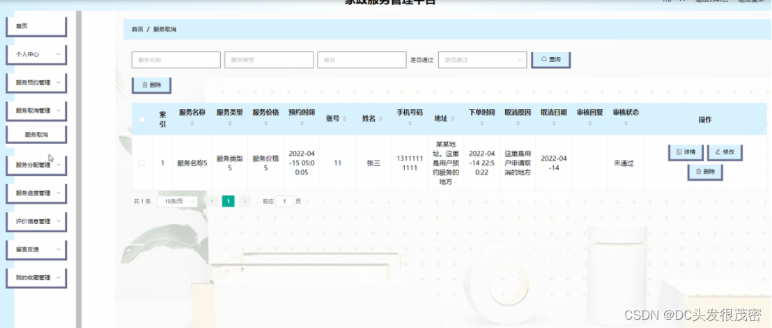 服务取消管理,在服务取消管理页面中可以对索引、服务名称、服务类型、服务价格、预约时间、账号、姓名、手机号码、地址、下单时间、取消原因、取消日期、审核回复、审核状态等内容进行详情、修改或删除等操作