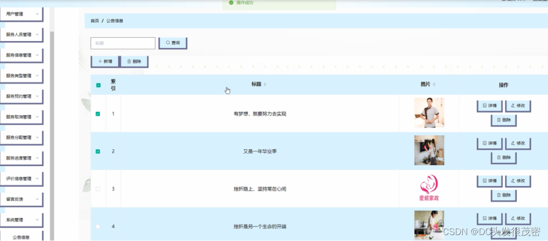 系统管理,在公告信息页面中可以对索引、标题、图片等内容进行详情、修改或删除等操作,并可以根据轮播图管理进行相应等操作